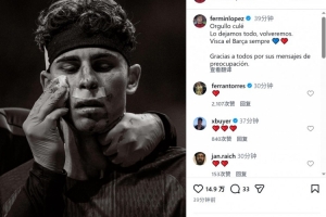 此役巴薩中場費爾明被馬競門將穆索踢到臉部,費爾明社媒曬出臉部受傷的照片,并寫道:“巴薩人的榮耀!我們已傾盡全力,我們會再回來的。巴薩萬歲,永遠!感謝大家的關(guān)心留言?!?/p>
