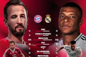 體育資訊4月15日訊 北京時(shí)間明天凌晨,拜仁將在歐冠1/4決賽次回合比賽中主場對陣皇馬,首回合拜仁2-1取勝。拜仁官方社媒曬出了凱恩、姆巴佩本賽季的數(shù)據(jù)。