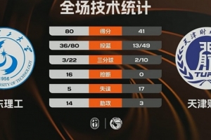 第四節(jié),王虹延續(xù)火力,天津財大不斷沖擊內(nèi)線苦苦支撐,王虹和邢欣相繼三分穿針,馬芮瑩反擊將分差拉開到40分以上,朱明慧內(nèi)線得手,最終,山東理工80-41大勝天津財大。