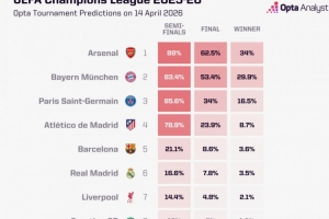 OPTA預測晉級概率:拜仁83.4%,阿森納88%,皇馬16.6%,葡體12%