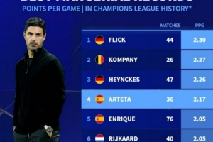 體育資訊4月16日訊 在歐冠淘汰賽次回合,阿森納0-0戰(zhàn)平葡體,總比分1-0晉級。以下為歐冠歷史主帥場均積分榜(至少執(zhí)教25場):