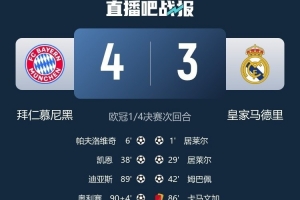體育資訊4月16日訊 歐冠1/4決賽次回合,拜仁主場(chǎng)4-3逆轉(zhuǎn)擊敗皇馬,并以6-4的總比分晉級(jí)四強(qiáng)。