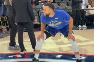 庫(kù)里踩著Logo超遠(yuǎn)“三分”出手 球通過(guò)反彈精準(zhǔn)空心入網(wǎng)