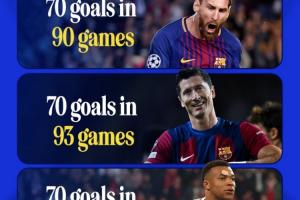 姆巴佩98場解鎖歐冠70球第三快,梅西90場解鎖70球為歷史最快