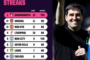 體育資訊4月16日訊 據(jù)Opta統(tǒng)計(jì),伯恩茅斯是本賽季英超連續(xù)不敗場(chǎng)次最多的球隊(duì)。