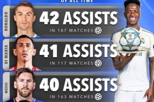 維尼修斯升第5!歐冠歷史助攻榜:C羅、天使、梅西前三 內(nèi)馬爾第4