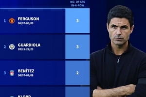 阿爾特塔連續(xù)兩賽季帶隊(duì)進(jìn)入歐冠四強(qiáng),成英超歷史第五位主教練