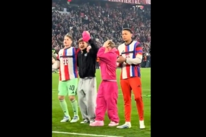 卡爾因傷缺席此役,賽后他與拜仁隊(duì)友一起慶祝晉級(jí),這位小將穿著一身粉色衣服,在球員之中格外顯眼,他的帽子還被比朔夫搶走。