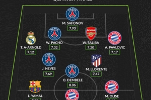 體育資訊4月16日訊 歐冠八強(qiáng)戰(zhàn)已經(jīng)完賽,whoscored也列出了本輪評(píng)分最佳陣容,巴黎4將、拜仁3人。