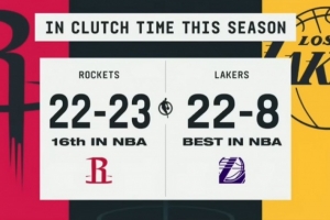 打到關(guān)鍵時刻有戲?湖人本季關(guān)鍵時刻戰(zhàn)績22-8聯(lián)盟第一 火箭第16
