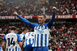 第45+3分鐘,格羅斯前場右路高空球傳中到禁區(qū)內(nèi),三笘薰后點(diǎn)小角度凌空抽射破門。
