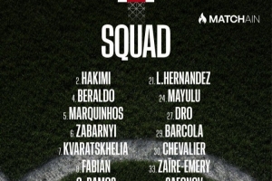 體育資訊4月19日訊 北京時間明天凌晨,巴黎將在法甲第30輪比賽中主場對陣?yán)锇?,巴黎公布了此役的球員名單,法比安回歸,努諾·門德斯缺席。