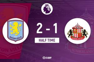 上半場補時2分鐘,阿斯頓維拉2-1桑德蘭。