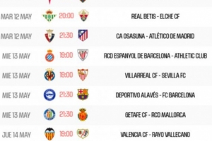體育資訊4月21日訊 西甲官方公布了第36輪賽程安排,馬競(jìng)、巴薩和皇馬將分別在北京時(shí)間5月13日、14日和15日凌晨出戰(zhàn)。
