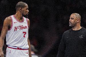 本賽季,杜蘭特(37歲193天)出戰(zhàn)77場(chǎng)比賽,場(chǎng)均上陣36.3分鐘聯(lián)盟第三高(僅次于馬克西和阿門(mén)),能得到25.9分5.4籃板4.7助攻。
