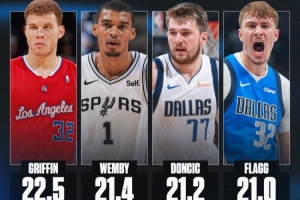 本賽季弗拉格場(chǎng)均21分,10-11賽季的格里芬場(chǎng)均22.5分,是00年至今場(chǎng)均得分最高的新秀,文班亞馬排在第二,東契奇排在第三。