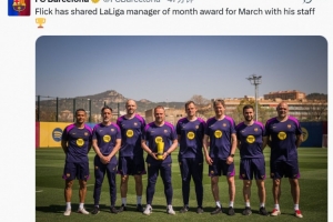 巴塞羅那在3月3場西甲保持全勝,主教練弗里克獲得了西甲聯(lián)賽頒發(fā)的三月最佳教練獎。弗里克一向重視教練團隊的工作,他因此要求與自己最信任的團隊成員一起領取這份榮譽。