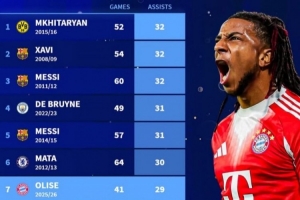 體育資訊4月11日訊 拜仁在歐冠客場2-1擊敗皇馬,奧利塞送出助攻?!掇D(zhuǎn)會市場》統(tǒng)計顯示他已經(jīng)躋身新世紀(jì)五大聯(lián)賽球員單賽季各項賽事助攻榜第7位。