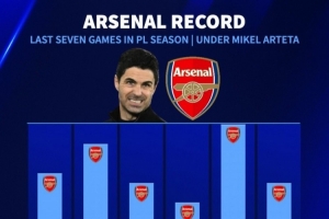 阿爾特塔執(zhí)教阿森納賽季最后7輪比賽拿分: