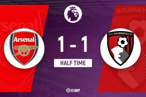 上半場(chǎng)補(bǔ)時(shí)2分鐘。半場(chǎng)戰(zhàn)罷,阿森納1-1伯恩茅斯。