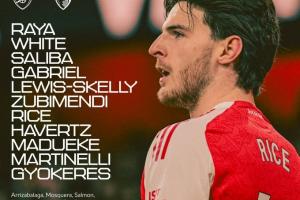 阿森納首發(fā):1-拉亞、4-本·懷特、2-薩利巴、6-加布里埃爾、49-斯凱利、36-蘇維門(mén)迪、41-賴斯、29-哈弗茨、20-馬杜埃凱、11-馬丁內(nèi)利、14-約克雷斯