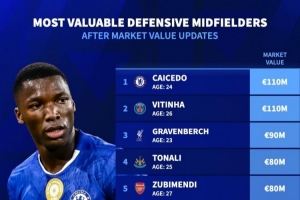 體育資訊4月11日訊 德國轉(zhuǎn)會市場列出了防守型中場(DM)德轉(zhuǎn)身價(jià)排名,凱塞多、維蒂尼亞1.1億歐居首。