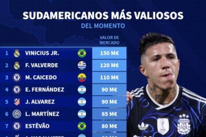 體育資訊4月12日訊 德國轉(zhuǎn)會市場列出了南美球員身價排名,維尼修斯1.5億歐居首,巴爾韋德1.2億歐次席。