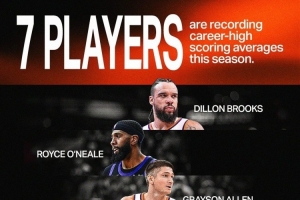 體育資訊4月12日訊 太陽官方社媒更新動(dòng)態(tài),曬出了本賽季隊(duì)中7位球員創(chuàng)造了職業(yè)生涯場(chǎng)均得分新高的海報(bào)。