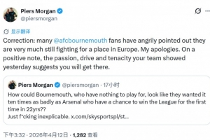 英國名嘴、阿森納球迷摩根在社媒痛批槍手的表現(xiàn),他表示無欲無求的伯恩茅斯比爭冠的阿森納展現(xiàn)出了更強(qiáng)烈的求勝欲望。