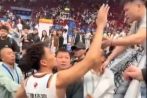 比賽結束后,場邊發(fā)生了一個小插曲,上海男籃球員李添榮想和場邊的球迷擊掌互動,但是遭到北京主場工作人員的攔截。