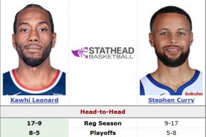 據(jù)統(tǒng)計,倫納德常規(guī)賽對陣庫里17勝9負,季后賽8勝5負。