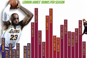 詹姆斯生涯各季扣籃數(shù):本賽季97扣湖人生涯新高 生涯最高為145扣
