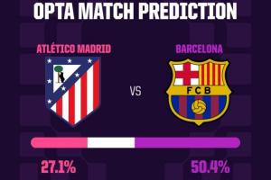 另一場1/4決賽,巴薩90分鐘內(nèi)客場取勝的概率為50.4%,而馬競勝率只有27.1%。但就晉級而言,馬競被視為絕對熱門,晉級概率達(dá)到79.6%,巴薩翻盤的概率僅為20.4%。
