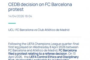 官方公告:在2026年4月8日(星期三)進行的巴塞羅那對陣馬德里競技的歐冠四分之一決賽首回合比賽后,巴塞羅那足球俱樂部就裁判的某項判罰提出了抗議。2026年4月13日,歐足聯(lián)道德與紀律審查機構(gòu)宣布對該抗議不予受理。