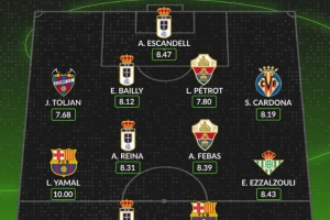 中場:亞馬爾(巴薩)、雷納(皇家奧維耶多)、費巴斯(埃爾切)、阿布德(貝蒂斯)